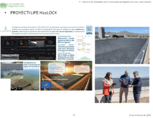 The LIFE H2OLOCK project was presented at the Ordinary General Assembly of the Lorca Irrigators’ Community, a key event for the agricultural sector in the region. In front of more than 300 irrigators from the Guadalentín Valley, the project’s progress and initial results were shared, consolidating its role as an innovative solution for efficient water management.